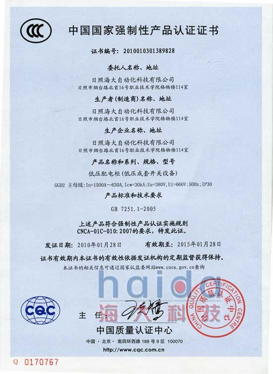 2010年1月28日,我公司獲得低壓配電柜(3C)中國國家強(qiáng)制性產(chǎn)品認(rèn)證證書。